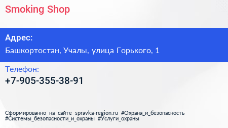 Smoking Shop по адресу Башкортостан, Учалы, улица Горького, 1 в дальнейшем Организация, размещена в следующих категориях: