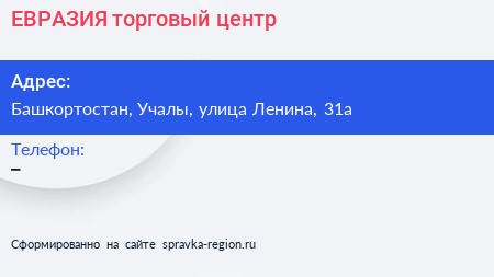 ЕВРАЗИЯ, торговый центр по адресу Башкортостан, Учалы, улица Ленина, 31а в дальнейшем Организация, размещена в следующих категориях: