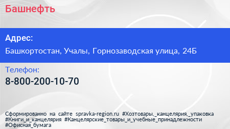 Башнефть по адресу Башкортостан, Учалы, Горнозаводская улица, 24Б в дальнейшем Организация, размещена в следующих категориях: