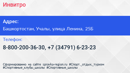 Инвитро по адресу Башкортостан, Учалы, улица Ленина, 25Б в дальнейшем Организация, размещена в следующих категориях: