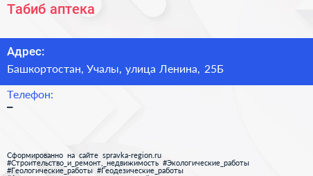 Табиб, аптека по адресу Башкортостан, Учалы, улица Ленина, 25Б в дальнейшем Организация, размещена в следующих категориях: