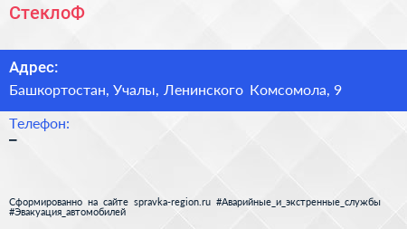 СтеклоФ по адресу Башкортостан, Учалы, Ленинского Комсомола, 9 в дальнейшем Организация, размещена в следующих категориях: