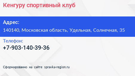 Кенгуру, спортивный клуб по адресу 140140, Московская область, Удельная, Солнечная, 35 в дальнейшем Организация, размещена в следующих категориях: