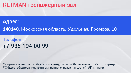 RETMAN, тренажерный зал по адресу 140140, Московская область, Удельная, Громова, 10 в дальнейшем Организация, размещена в следующих категориях: