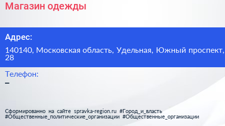Магазин одежды по адресу 140140, Московская область, Удельная, Южный проспект, 28 в дальнейшем Организация, размещена в следующих категориях: