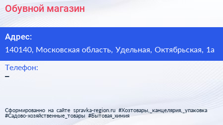Обувной магазин по адресу 140140, Московская область, Удельная, Октябрьская, 1а в дальнейшем Организация, размещена в следующих категориях: