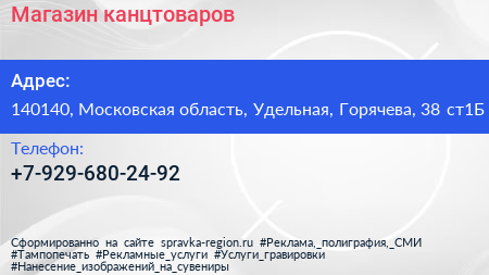 Магазин канцтоваров по адресу 140140, Московская область, Удельная, Горячева, 38 ст1Б в дальнейшем Организация, размещена в следующих категориях: