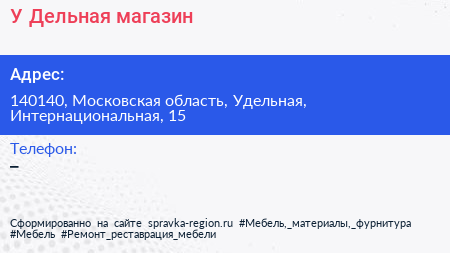 У Дельная, магазин по адресу 140140, Московская область, Удельная, Интернациональная, 15 в дальнейшем Организация, размещена в следующих категориях: