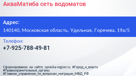 АкваМатиба, сеть водоматов по адресу 140140, Московская область, Удельная, Горячева, 19а/5 в дальнейшем Организация, размещена в следующих категориях: