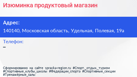 Изюминка, продуктовый магазин по адресу 140140, Московская область, Удельная, Полевая, 19а в дальнейшем Организация, размещена в следующих категориях: