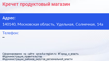 Кречет, продуктовый магазин по адресу 140140, Московская область, Удельная, Солнечная, 14а в дальнейшем Организация, размещена в следующих категориях: