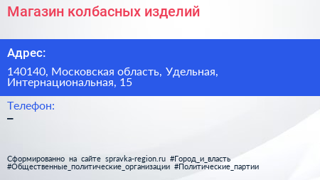 Магазин колбасных изделий по адресу 140140, Московская область, Удельная, Интернациональная, 15 в дальнейшем Организация, размещена в следующих категориях: