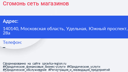 Сгомонь, сеть магазинов по адресу 140140, Московская область, Удельная, Южный проспект, 28а в дальнейшем Организация, размещена в следующих категориях: