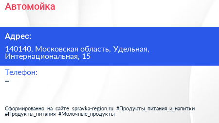 Автомойка по адресу 140140, Московская область, Удельная, Интернациональная, 15 в дальнейшем Организация, размещена в следующих категориях: