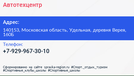 Автотехцентр по адресу 140153, Московская область, Удельная, деревня Верея, 160Б в дальнейшем Организация, размещена в следующих категориях:
