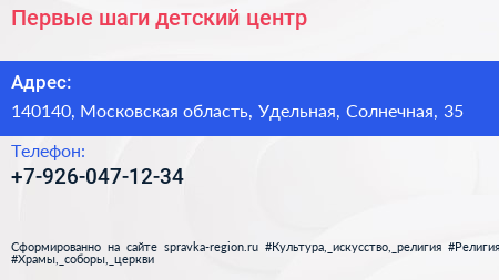 Первые шаги, детский центр по адресу 140140, Московская область, Удельная, Солнечная, 35 в дальнейшем Организация, размещена в следующих категориях: