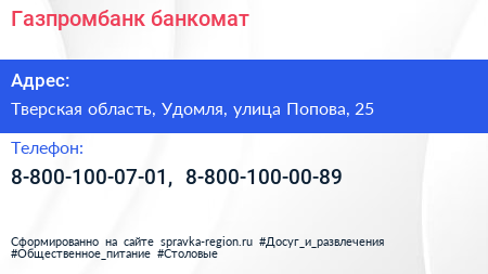 Газпромбанк, банкомат по адресу Тверская область, Удомля, улица Попова, 25 в дальнейшем Организация, размещена в следующих категориях: