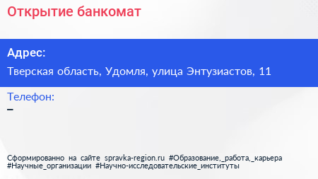Открытие, банкомат по адресу Тверская область, Удомля, улица Энтузиастов, 11 в дальнейшем Организация, размещена в следующих категориях: