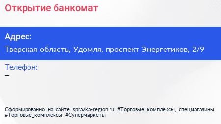 Открытие, банкомат по адресу Тверская область, Удомля, проспект Энергетиков, 2/9 в дальнейшем Организация, размещена в следующих категориях: