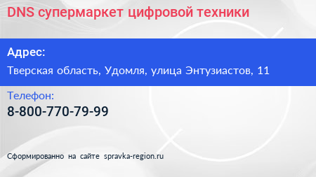 DNS, супермаркет цифровой техники по адресу Тверская область, Удомля, улица Энтузиастов, 11 в дальнейшем Организация, размещена в следующих категориях: