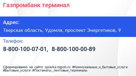 Газпромбанк, терминал по адресу Тверская область, Удомля, проспект Энергетиков, 9 в дальнейшем Организация, размещена в следующих категориях: