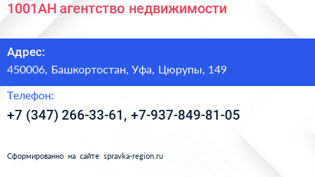 1001АН, агентство недвижимости по адресу 450006, Башкортостан, Уфа, Цюрупы, 149 в дальнейшем Организация, размещена в следующих категориях: