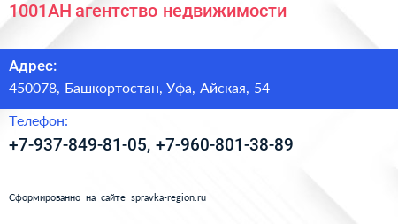 1001АН, агентство недвижимости по адресу 450078, Башкортостан, Уфа, Айская, 54 в дальнейшем Организация, размещена в следующих категориях: