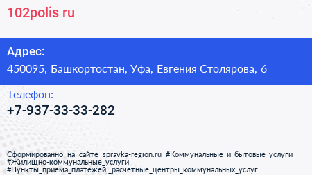 102polis.ru по адресу 450095, Башкортостан, Уфа, Евгения Столярова, 6 в дальнейшем Организация, размещена в следующих категориях: