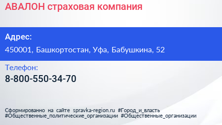 АВАЛОН, страховая компания по адресу 450001, Башкортостан, Уфа, Бабушкина, 52 в дальнейшем Организация, размещена в следующих категориях:
