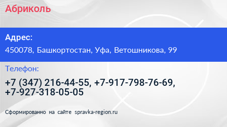 Абриколь по адресу 450078, Башкортостан, Уфа, Ветошникова, 99 в дальнейшем Организация, размещена в следующих категориях: