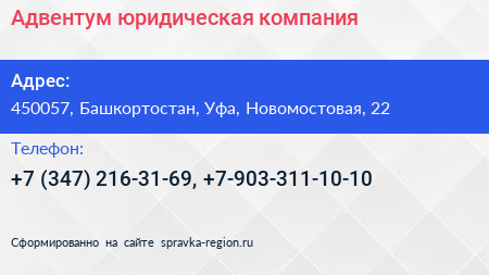 Адвентум, юридическая компания по адресу 450057, Башкортостан, Уфа, Новомостовая, 22 в дальнейшем Организация, размещена в следующих категориях: