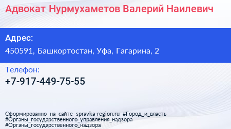 Адвокат Нурмухаметов Валерий Наилевич по адресу 450591, Башкортостан, Уфа, Гагарина, 2 в дальнейшем Организация, размещена в следующих категориях: