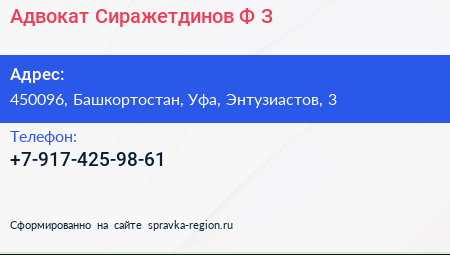 Адвокат Сиражетдинов Ф.З. по адресу 450096, Башкортостан, Уфа, Энтузиастов, 3 в дальнейшем Организация, размещена в следующих категориях: