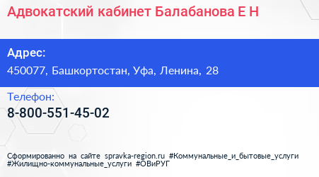 Адвокатский кабинет Балабанова Е.Н. по адресу 450077, Башкортостан, Уфа, Ленина, 28 в дальнейшем Организация, размещена в следующих категориях: