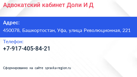 Адвокатский кабинет Доли И.Д. по адресу 450078, Башкортостан, Уфа, улица Революционная, 221 в дальнейшем Организация, размещена в следующих категориях: