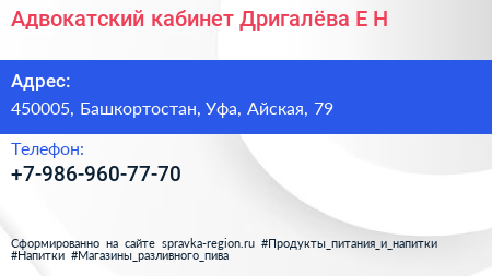 Адвокатский кабинет Дригалёва Е.Н. по адресу 450005, Башкортостан, Уфа, Айская, 79 в дальнейшем Организация, размещена в следующих категориях: