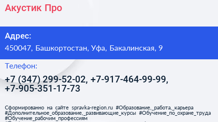 Акустик Про по адресу 450047, Башкортостан, Уфа, Бакалинская, 9 в дальнейшем Организация, размещена в следующих категориях: