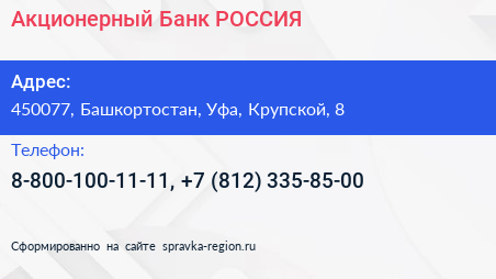 Акционерный Банк РОССИЯ по адресу 450077, Башкортостан, Уфа, Крупской, 8 в дальнейшем Организация, размещена в следующих категориях: