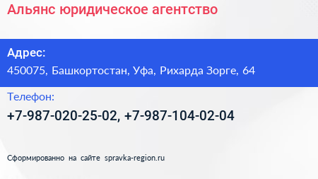 Альянс, юридическое агентство по адресу 450075, Башкортостан, Уфа, Рихарда Зорге, 64 в дальнейшем Организация, размещена в следующих категориях: