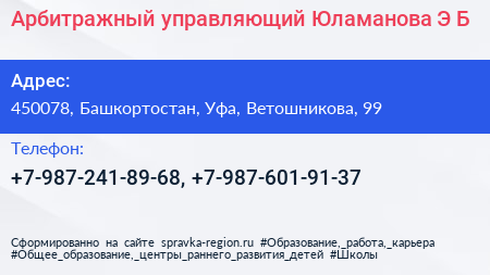 Арбитражный управляющий Юламанова Э.Б. по адресу 450078, Башкортостан, Уфа, Ветошникова, 99 в дальнейшем Организация, размещена в следующих категориях: