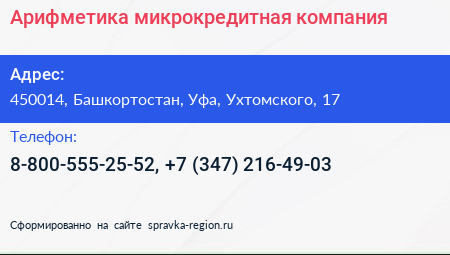 Арифметика, микрокредитная компания по адресу 450014, Башкортостан, Уфа, Ухтомского, 17 в дальнейшем Организация, размещена в следующих категориях:
