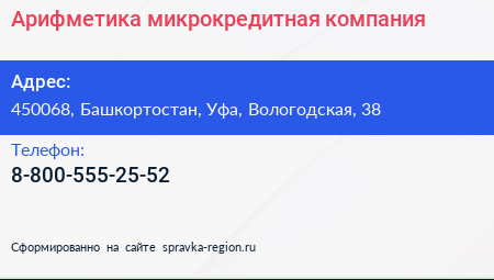 Арифметика, микрокредитная компания по адресу 450068, Башкортостан, Уфа, Вологодская, 38 в дальнейшем Организация, размещена в следующих категориях:
