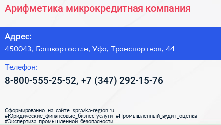 Арифметика, микрокредитная компания по адресу 450043, Башкортостан, Уфа, Транспортная, 44 в дальнейшем Организация, размещена в следующих категориях: