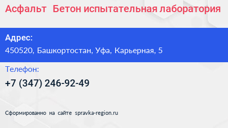 Асфальт+ Бетон, испытательная лаборатория по адресу 450520, Башкортостан, Уфа, Карьерная, 5 в дальнейшем Организация, размещена в следующих категориях: