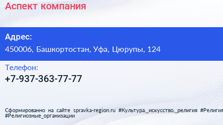 Аспект, компания по адресу 450006, Башкортостан, Уфа, Цюрупы, 124 в дальнейшем Организация, размещена в следующих категориях: