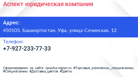 Аспект, юридическая компания по адресу 450103, Башкортостан, Уфа, улица Сочинская, 12 в дальнейшем Организация, размещена в следующих категориях: