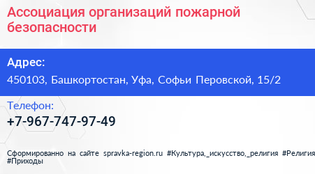 Ассоциация организаций пожарной безопасности по адресу 450103, Башкортостан, Уфа, Софьи Перовской, 15/2 в дальнейшем Организация, размещена в следующих категориях: