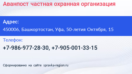 Аванпост, частная охранная организация по адресу 450006, Башкортостан, Уфа, 50-летия Октября, 15 в дальнейшем Организация, размещена в следующих категориях: