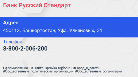 Банк Русский Стандарт по адресу 450112, Башкортостан, Уфа, Ульяновых, 31 в дальнейшем Организация, размещена в следующих категориях: