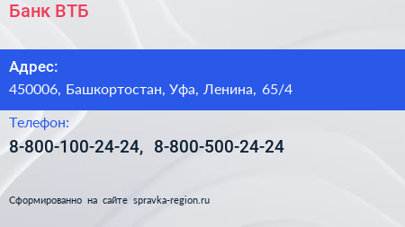 Банк ВТБ по адресу 450006, Башкортостан, Уфа, Ленина, 65/4 в дальнейшем Организация, размещена в следующих категориях: